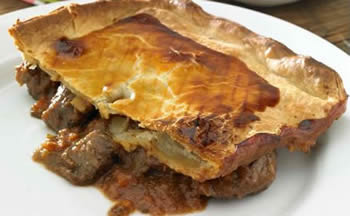 Brush the rim of the pie dish with the egg, lay the pastry on top, press the edges to seal, then cut off any excess pastry. Make a slit in the pastry and brush all over with the beaten egg. Bake in a pre-heated oven at 200° C, until the pastry is golden brown, about 30 minutes.